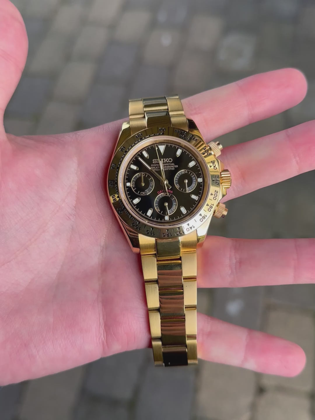 The movement in this watch is Seiko VK, which is mecha-quartz. The watch has a working chronograph function. The seconds are counted in the middle circle on the dial.