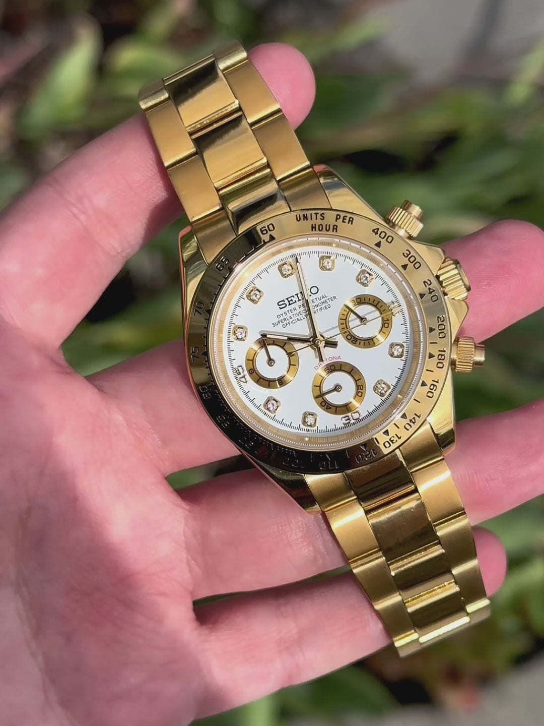 The movement in this watch is Seiko VK, which is mecha-quartz. The watch has a working chronograph function. The seconds are counted in the middle circle on the dial.